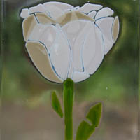 Tulpen waren haar lievelingsbloemen, vooral de witte. Nu zij er niet meer is, hangt haar bloem - eeuwig in bloei - voor mijn raam. Het is ook mogelijk een dergelijke plaat te maken als sluitplaat voor de urnennis.