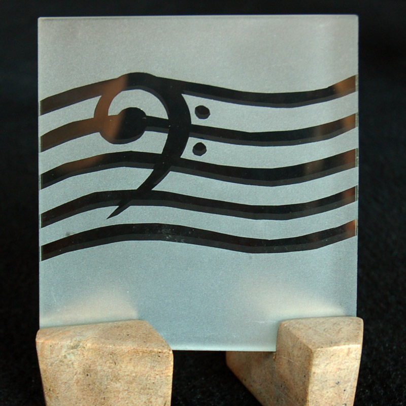 Voor de nabestaanden van een cello spelende vader maakte ik kleine herdenkingsobjecten voor thuis, in de vensterbank, op het buro etc. Het zijn kleine glasplaatjes met een gezandstraalde bassleutel erop, staand in een stenen sokkeltje.