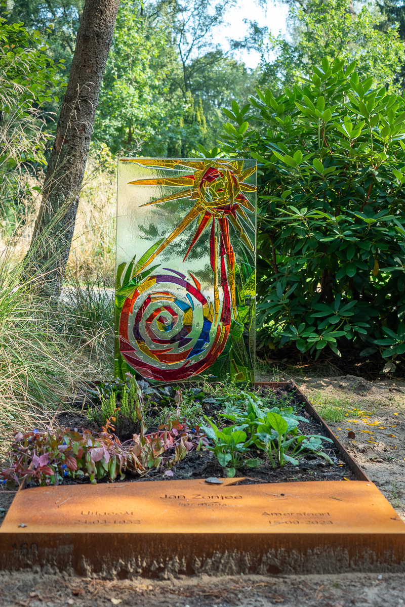 Het herinneren van een dierbare, het eren van een dierbare kan de vorm krijgen van een glasmonument(je). Daar besteed ik speciale zorg aan. Van belang is altijd dat het object een plek markeert waar je tot jezelf komt, in herinnering met je geliefde. Een plek waar verdriet en gemis letterlijk ruimte krijgen, er mogen zijn. Waar ook het leven gevierd mag worden, voorbij het verdriet. Die plek kan op een begraafplaats zijn, maar ook in de eigen tuin, in de vensterbank, op tafel, bureau of nachtkastje.